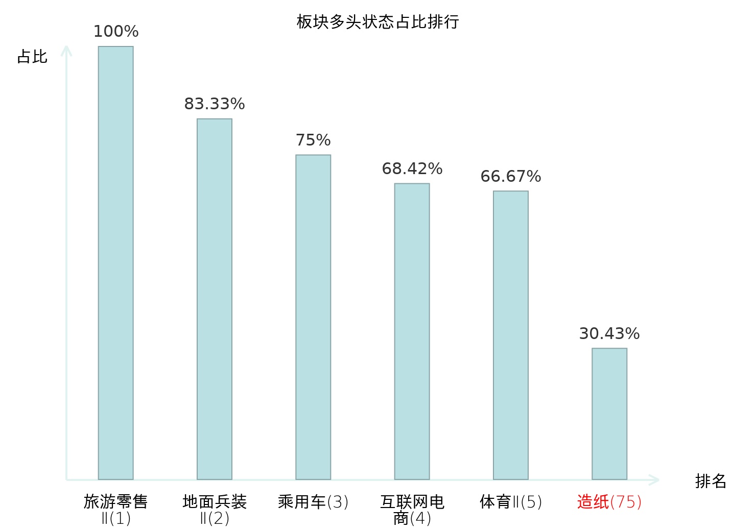 全市场所有行业板块中主力多头状态占比排名中,旅游零售Ⅱ板块位居第一。房屋建设Ⅱ板块名次提升最快,较昨日上升50位。