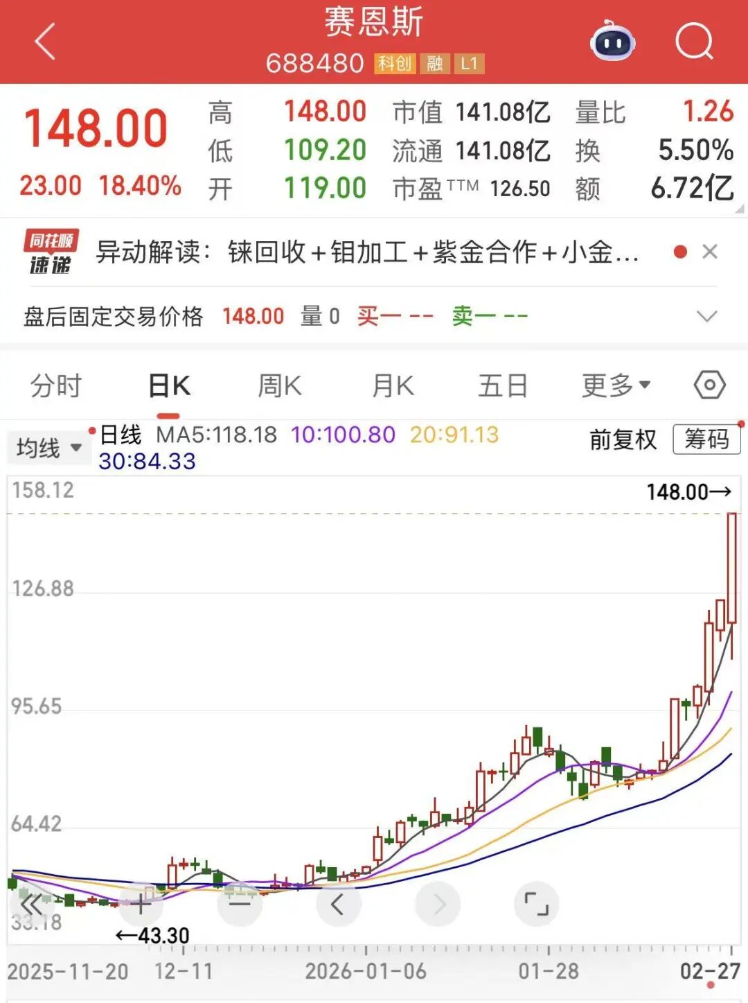 赛恩斯(688480)于今日盘后公告,公司股票连续3个交易日内收盘价格涨幅偏离值累计达到30%,属于股票交易异常波动情形。该股本周走出4连阳,今日大涨18.4%,一周累计涨幅超52%。