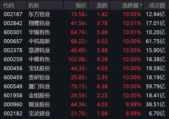 盘面上,小金属板块掀起涨停潮,东方锆业、翔鹭钨业、华锡有色、厦门钨业等十余股先后涨停。
