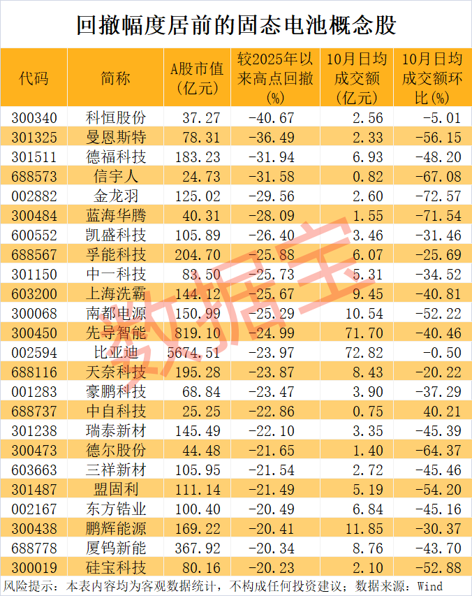 据数据宝统计,10月17日收盘价与年内高点相比,24只固态电池概念股回撤幅度超20%,德福科技、中一科技、上海洗霸、先导智能等年内翻倍牛股名列其中。