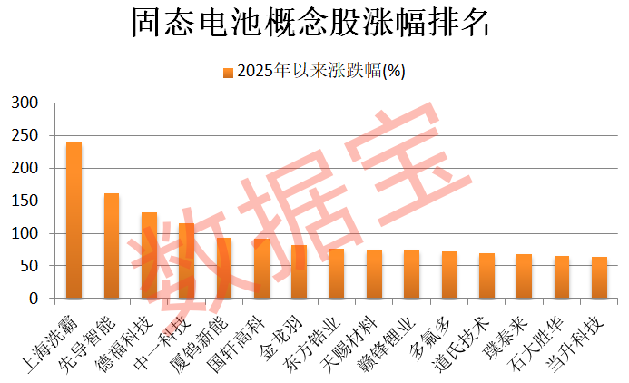 二级市场上,多只固态电池概念股走势强劲。据证券时报·数据宝统计,截至10月17日收盘,今年以来共20只概念股累计涨幅超50%,其中4股累计涨幅翻倍,分别是上海洗霸、先导智能、德福科技、中一科技。