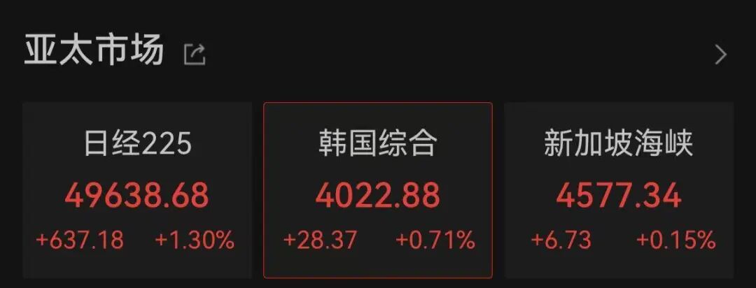 亚太股市集体飘红,其中,日经225指数涨逾1%,韩国综合指数涨超0.7%。