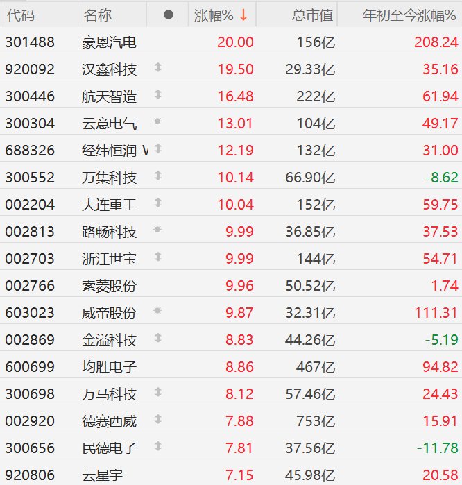 A股市场无人驾驶概念股继续活跃,其中,豪恩汽电20CM涨停,汉鑫科技涨超19%,航天智造涨超16%,云意电气涨超13%,经纬恒润涨超12%,万集科技涨超10%,大连重工、路畅科技、浙江世宝、索菱股份10CM涨停,威帝股份逼近涨停,金溢科技、均胜电子、万马科技涨超8%,德赛西威、民德电子、云星宇涨超7%。