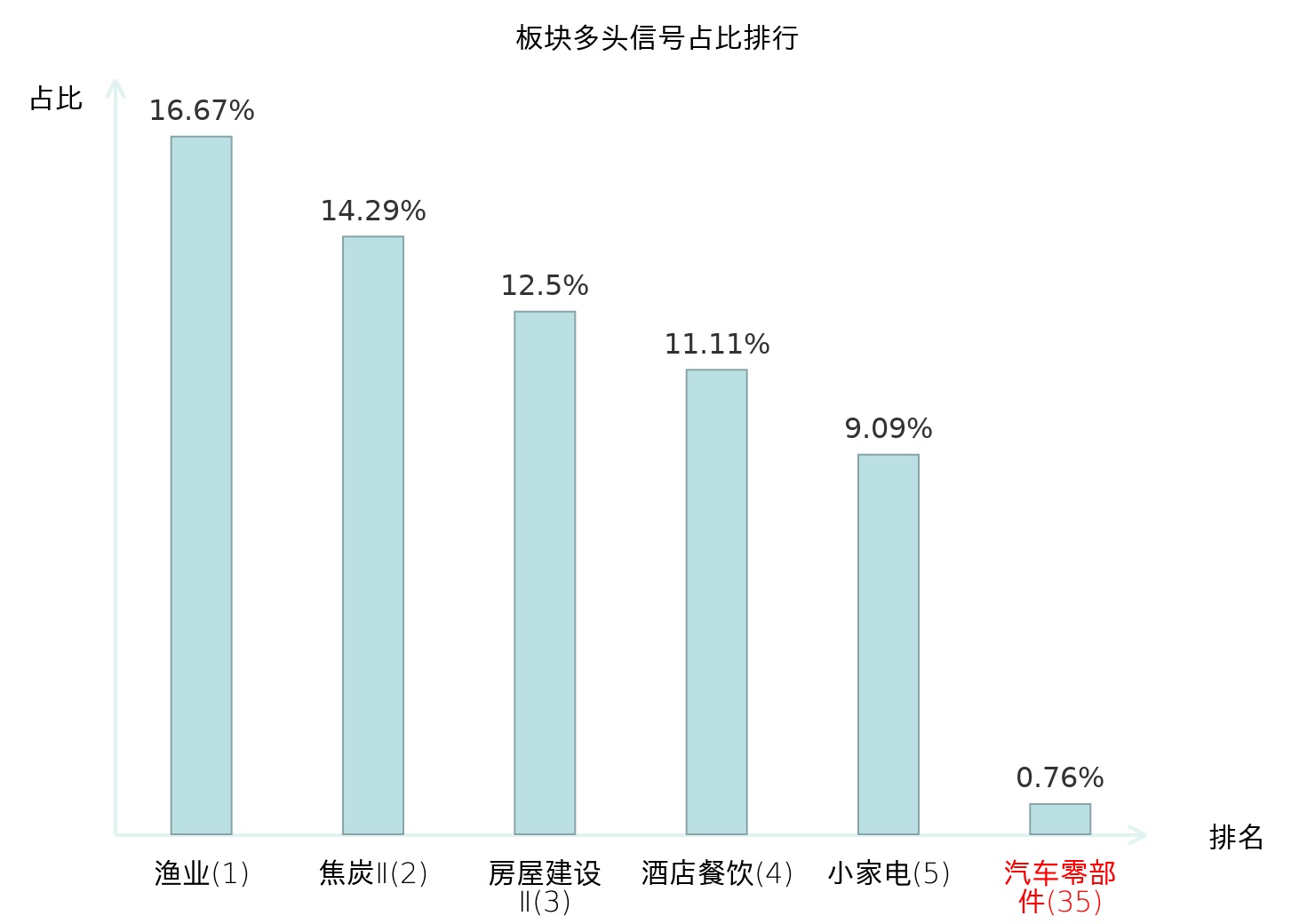 全市场所有行业板块中主力多头信号占比排名中,渔业板块位居第一。渔业板块名次提升最快,较昨日上升121位。