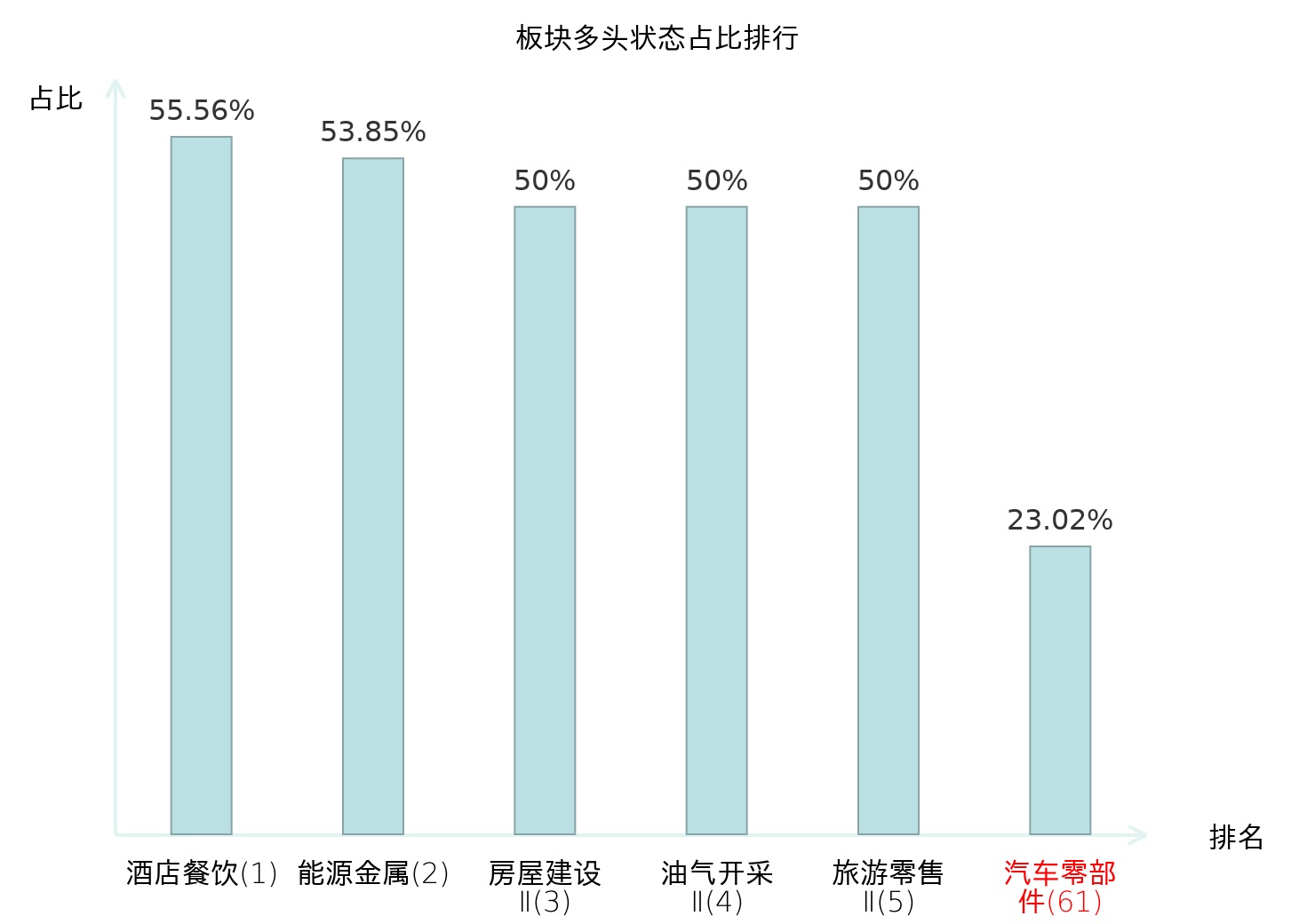 全市场所有行业板块中主力多头状态占比排名中,酒店餐饮板块位居第一。饰品板块名次提升最快,较昨日上升84位。