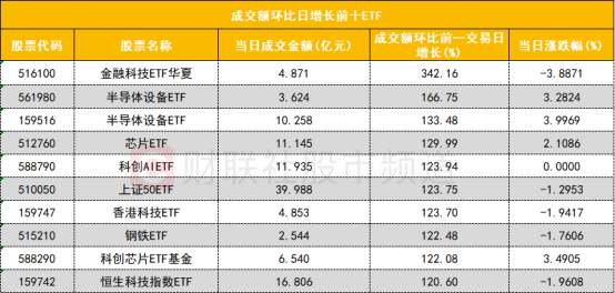 从成交额环比增长前十的ETF来看,金融科技ETF华夏(516100)成交额环比增长342%位居首位;半导体设备ETF(561980)成交额环比增长166%位居次席。