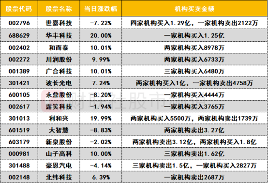 今日龙虎榜机构活跃度较高,买入方面,世嘉科技获四家机构买入1.29亿,但遭一家机构卖出2122万。算力硬件概念股川润股份获两家机构买入6733万。另一只算力硬件概念股华丰科技获一家机构买入1.25亿。