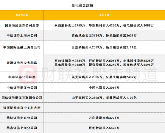 量化资金活跃度较高,机器人概念股巨轮智能获两家量化席位买入1亿,但另一只机器人概念股万向钱潮遭两家量化席位卖出7125万。算力硬件股华丰科技获一家量化席位买入1.03亿,但遭两家量化席位卖出1.02亿。