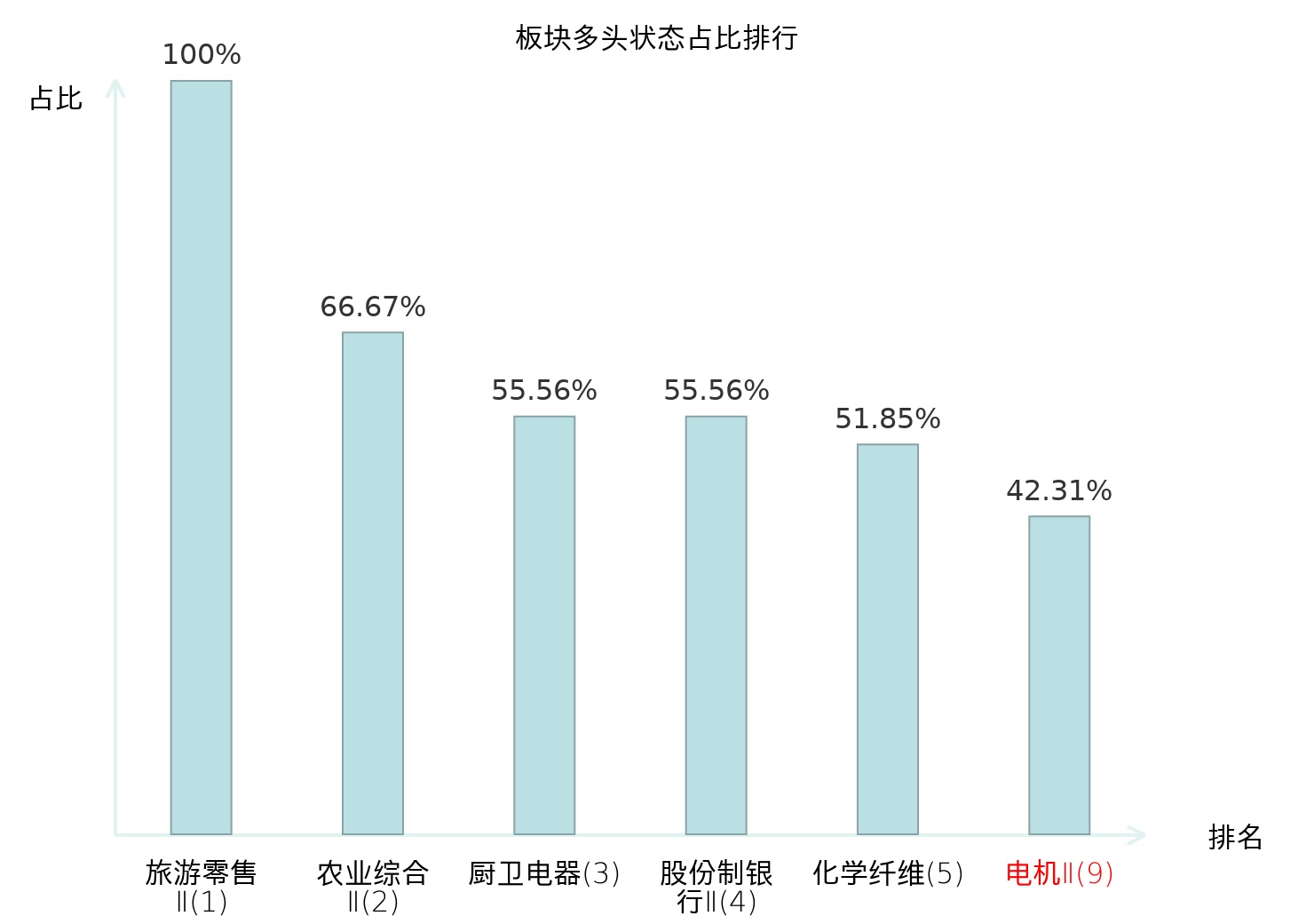 全市场所有行业板块中主力多头状态占比排名中,旅游零售Ⅱ板块位居第一。国有大型银行Ⅱ板块名次提升最快,较昨日上升103位。
