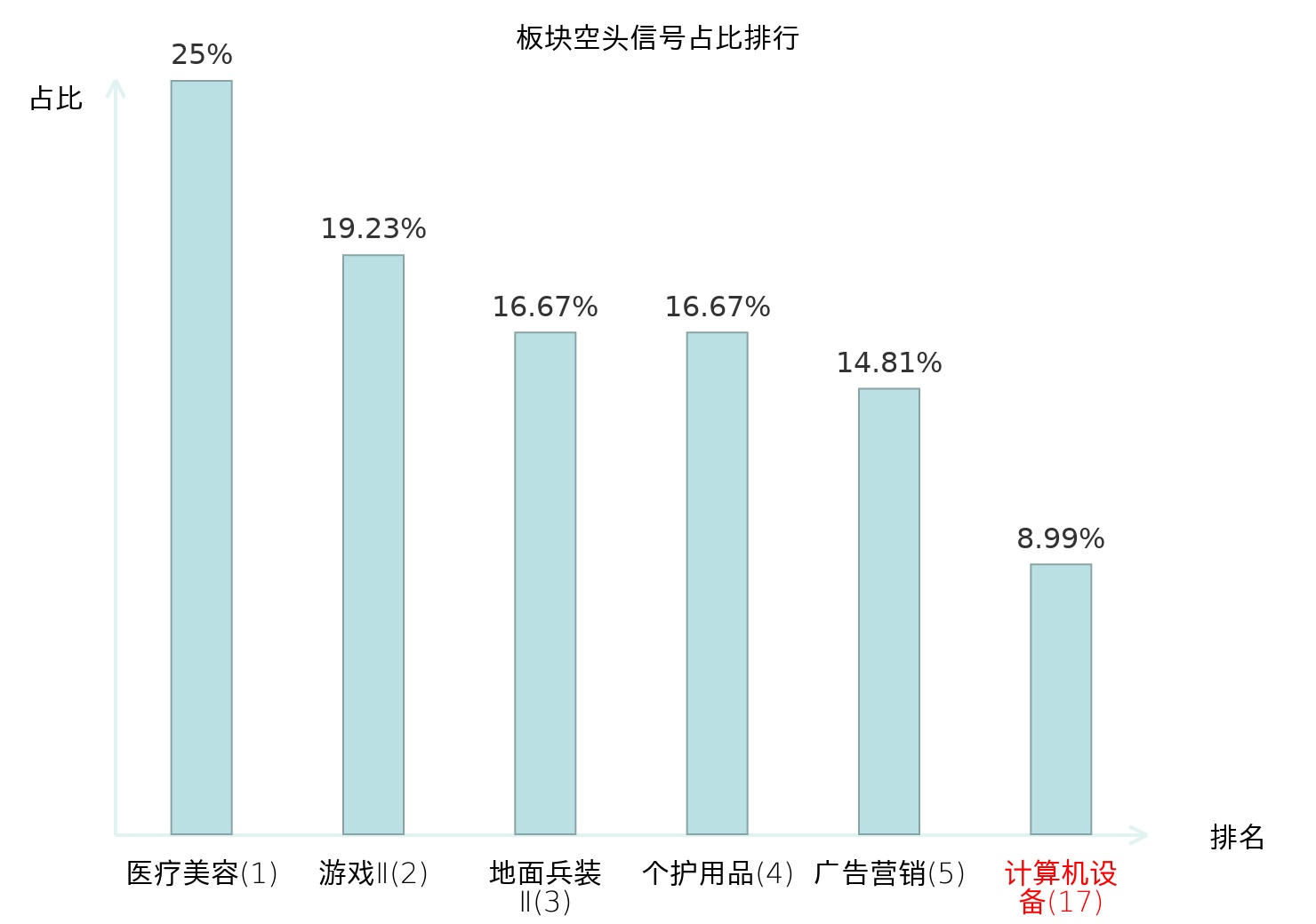 全市场所有行业板块中主力空头信号占比排名中,医疗美容板块位居第一。游戏Ⅱ板块名次提升最快,较昨日上升122位。