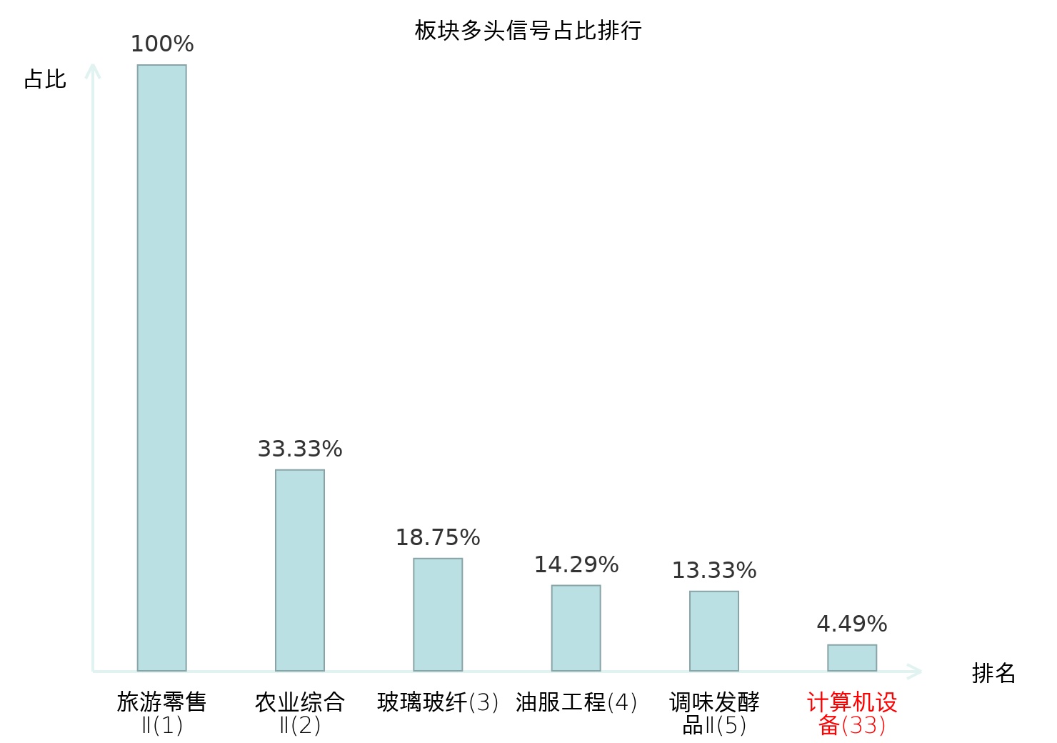 全市场所有行业板块中主力多头信号占比排名中,旅游零售Ⅱ板块位居第一。旅游零售Ⅱ板块名次提升最快,较昨日上升130位。