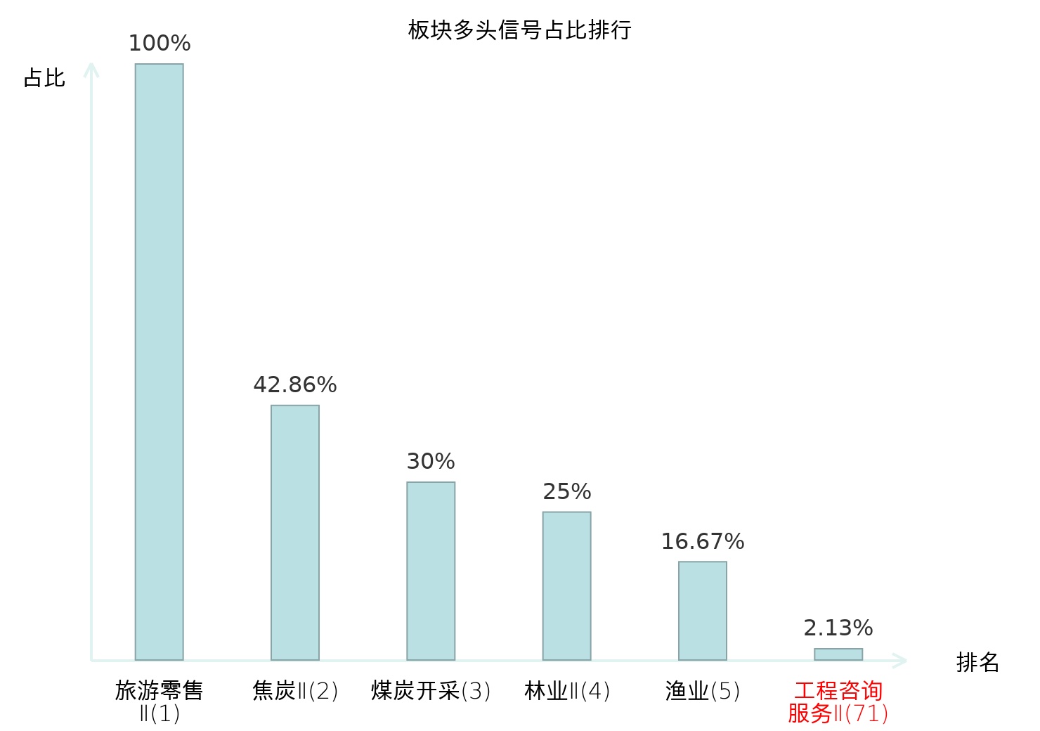 全市场所有行业板块中主力多头信号占比排名中,旅游零售Ⅱ板块位居第一。旅游零售Ⅱ板块名次提升最快,较昨日上升130位。