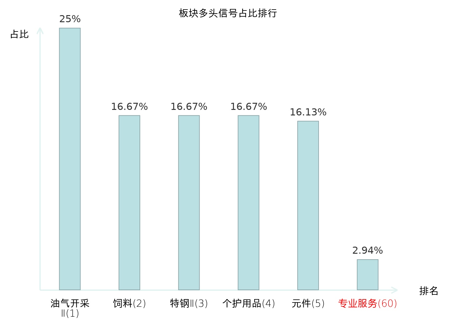 全市场所有行业板块中主力多头信号占比排名中,油气开采Ⅱ板块位居第一。个护用品板块名次提升最快,较昨日上升112位。