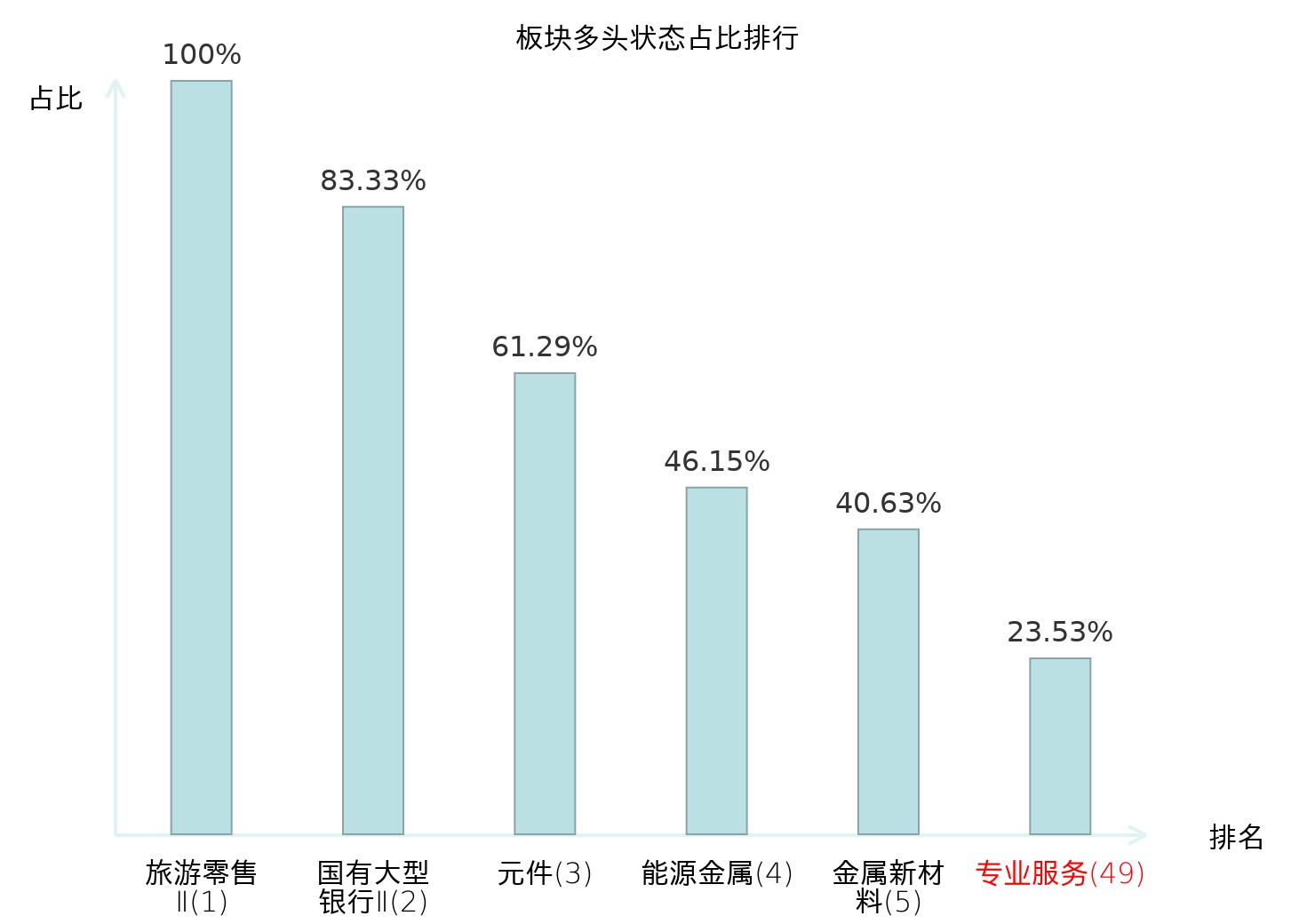 全市场所有行业板块中主力多头状态占比排名中,旅游零售Ⅱ板块位居第一。数字媒体板块名次提升最快,较昨日上升67位。