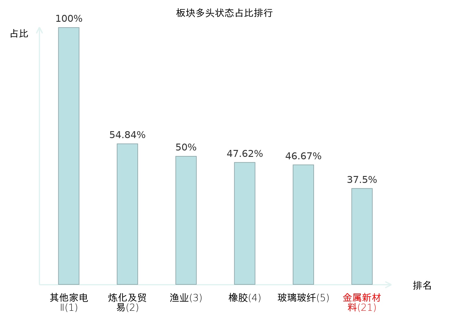 全市场所有行业板块中主力多头状态占比排名中,其他家电Ⅱ板块位居第一。铁路公路板块名次提升最快,较昨日上升37位。
