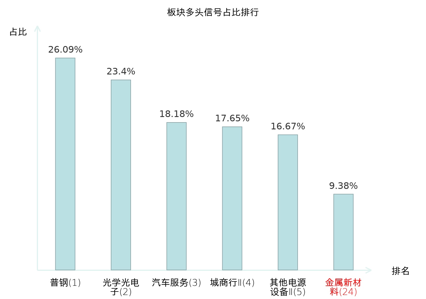 全市场所有行业板块中主力多头信号占比排名中,普钢板块位居第一。国有大型银行Ⅱ板块名次提升最快,较昨日上升116位。