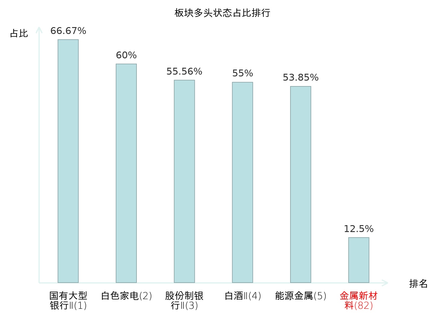 全市场所有行业板块中主力多头状态占比排名中,国有大型银行Ⅱ板块位居第一。林业Ⅱ板块名次提升最快,较昨日上升99位。