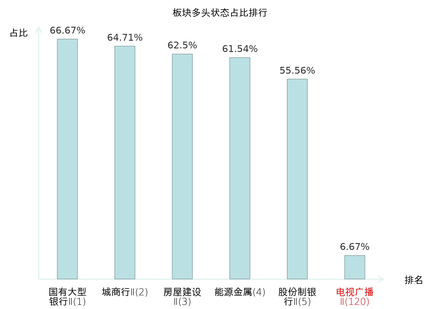 全市场所有行业板块中主力多头状态占比排名中,国有大型银行Ⅱ板块位居第一。普钢板块名次提升最快,较昨日上升65位。