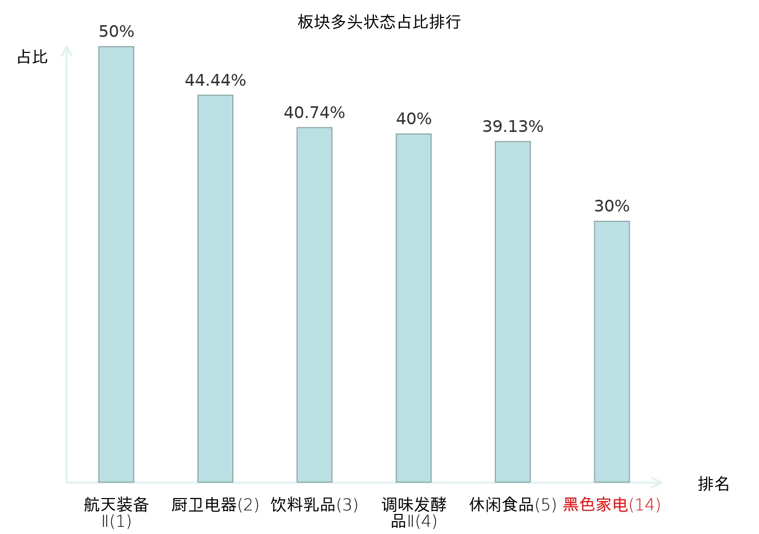 全市场所有行业板块中主力多头状态占比排名中,航天装备Ⅱ板块位居第一。林业Ⅱ板块名次提升最快,较昨日上升92位。