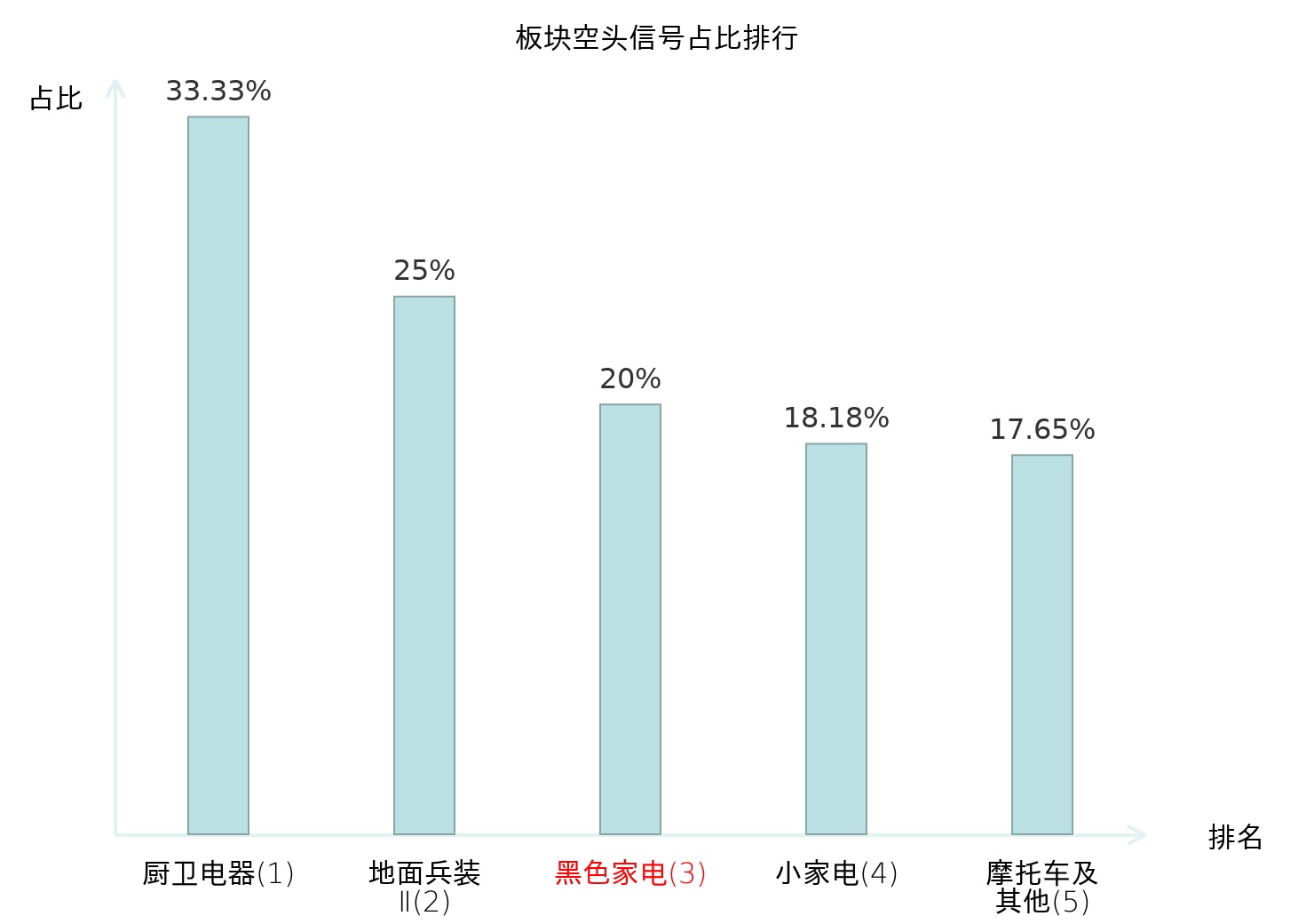 全市场所有行业板块中主力空头信号占比排名中,厨卫电器板块位居第一。服装家纺板块名次提升最快,较昨日上升124位。