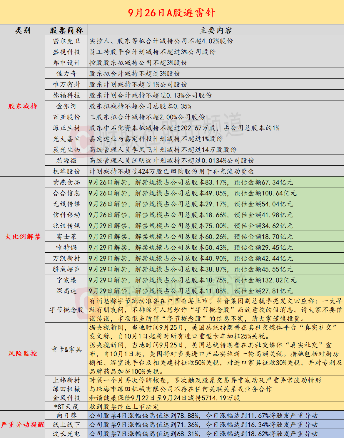 导读:财联社9月26日投资避雷针,近日,A股及海外市场潜在风险事件如下。国内经济信息方面包括:1)国内商品期市夜盘收盘多数下跌,化工品跌幅居前;2)抖音副总裁回应字节跳动港股上市传言,市场很多“字节概念股”信息不实;公司方面重点关注包括:1)20CM两连板上纬新材时隔一个月再次停牌核查,多次触及股票交易异常波动及严重异常波动情形;2)绿田机械公告,与珠海市绿田机械有限公司不存在任何关联关系或业务合作;海外市场重点关注包括:1)美股三大指数集体收跌,甲骨文跌超5%;2)自10月1日起,美国将对多类进口产品实施新一轮高额关税。