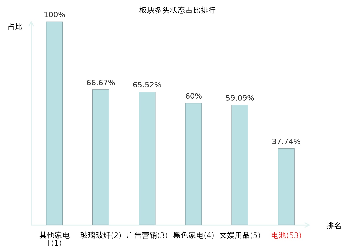 全市场所有行业板块中主力多头状态占比排名中,其他家电Ⅱ板块位居第一。体育Ⅱ板块名次提升最快,较昨日上升57位。