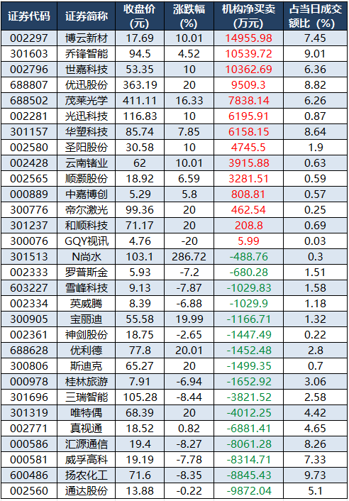 龙虎榜机构净买入14股 博云新材居首