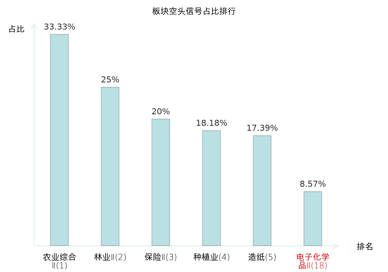 全市场所有行业板块中主力空头信号占比排名中,农业综合Ⅱ板块位居第一。炼化及贸易板块名次提升最快,较昨日上升115位。