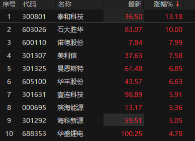 上证报中国证券网讯 11月12日午后,固态电池概念股异动拉升,截至13时14分,石大胜华涨停,泰和科技涨超10%,诺德股份涨近8%,美利信、壹连科技、海科新源、华盛锂电等纷纷冲高。