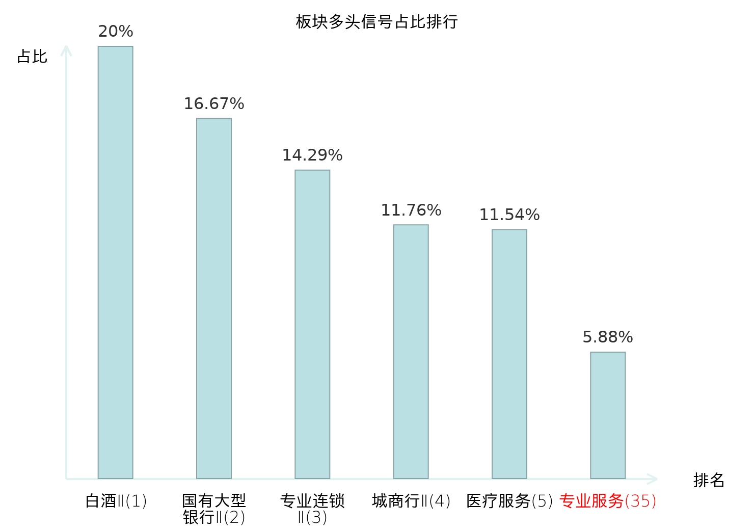 全市场所有行业板块中主力多头信号占比排名中,白酒Ⅱ板块位居第一。国有大型银行Ⅱ板块名次提升最快,较昨日上升121位。