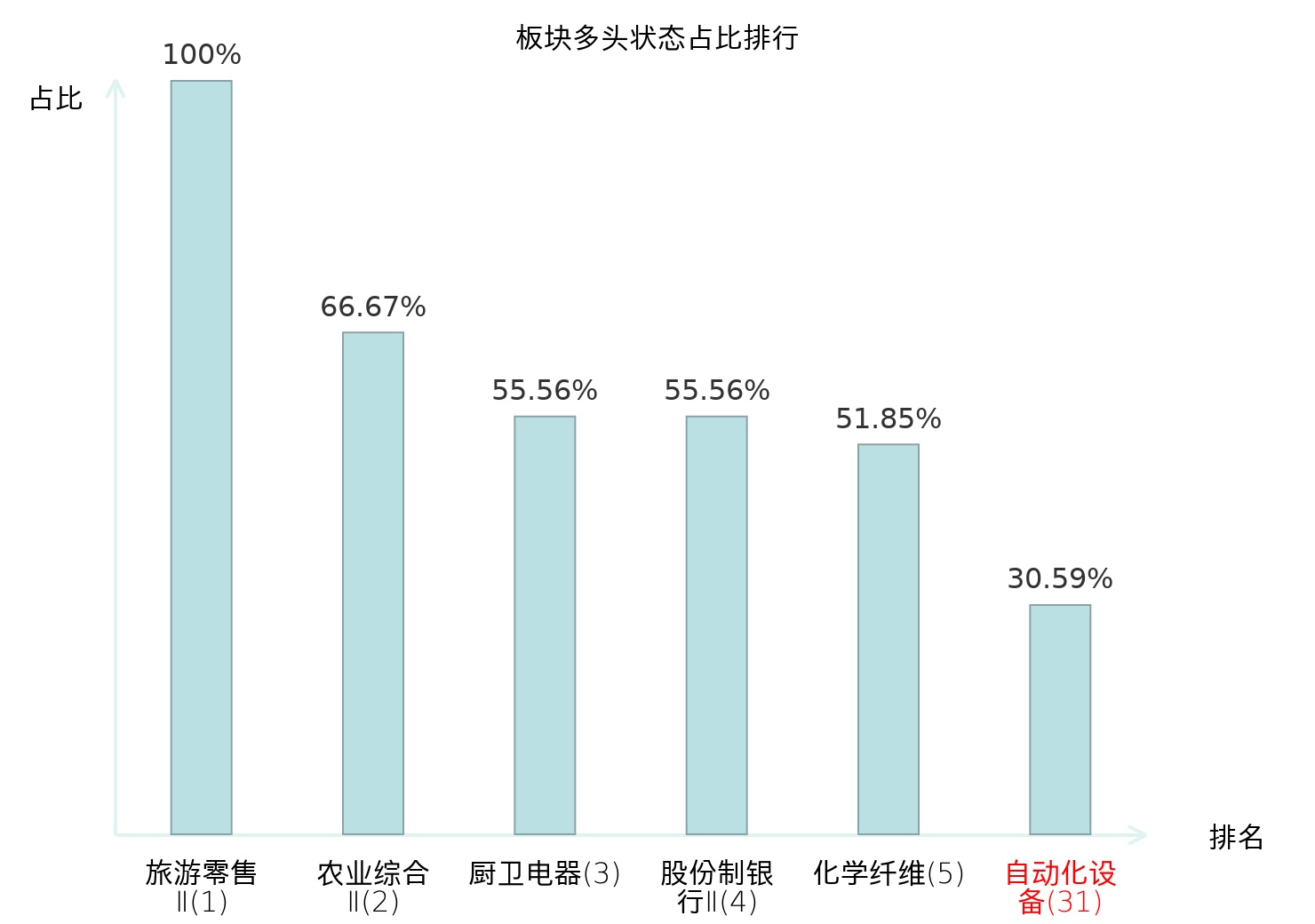 全市场所有行业板块中主力多头状态占比排名中,旅游零售Ⅱ板块位居第一。国有大型银行Ⅱ板块名次提升最快,较昨日上升103位。