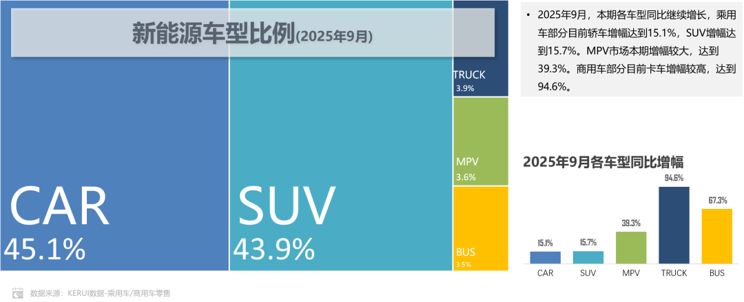 2025年9月,CAR占比45.1%,相比同期下滑1.7个百分点;SUV、MPV份额分别达到43.9%和3.6%,卡车份额为3.9%,客车为3.2%。随着政策扶持力度增加以及续航里程的提升,卡车市场份额持续扩大。