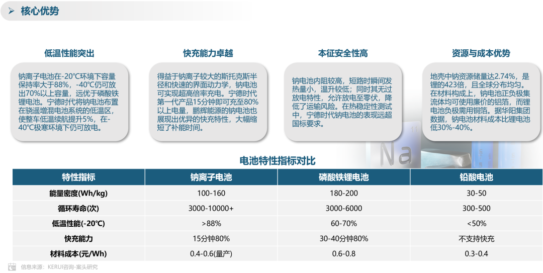 钠离子电池的核心优势体现在低温性能突出、快充能力卓越、本征安全性高和资源与成本优势上。