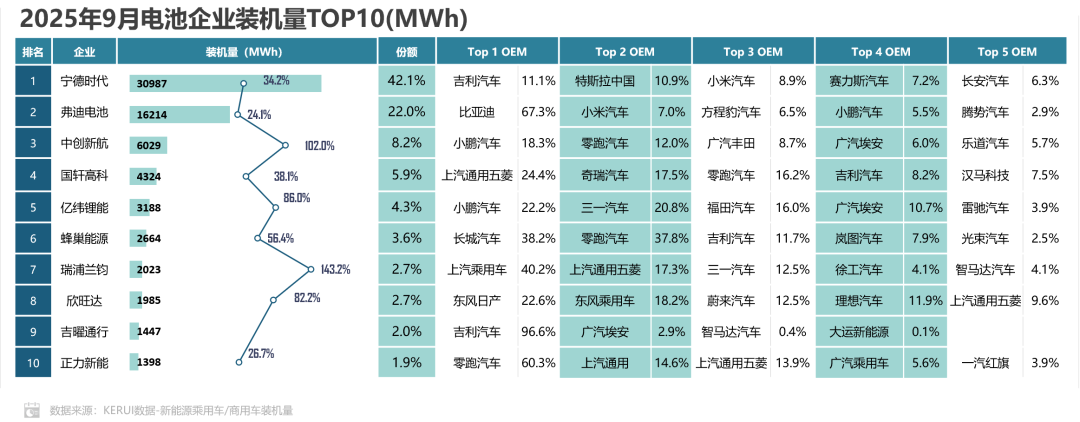 2025年9月新能源汽车单车平均电量为53.0kWh,同比增长17.3%。1-9月,比亚迪、特斯拉和小米成为动力电池装机量主要贡献企业。