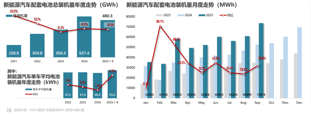 2025年9月,新能源汽车动力电池装机量73.7GWh,同比增长39.9%。