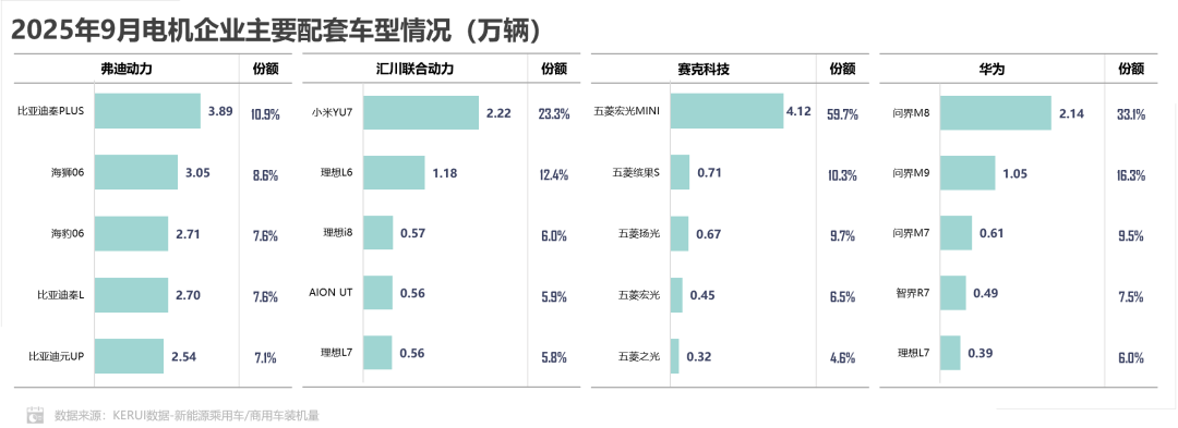 2025年9月,弗迪动力前五车型占比达到41.8%。比亚迪秦PLUS占比达到10.9%,前五车型单车售价均较低,走量车型保证了弗迪动力每月的配套量。汇川联合动力配套车型中小米YU7占比最高,达到23.3%。赛克科技主要配备五菱品牌,其中五菱宏光MINI单车型占比达到59.7%,华为主要配套车型为问界系列,其中M8车型份额达到33.1%。