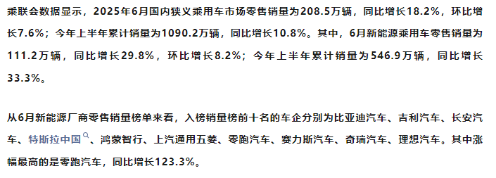 消息方面,根据乘联分会发布数据显示,6月份新能源狭义乘用车销量111.2万辆,同比增长29.8%,环比增长8.2%;今年上半年累计销量546.9万辆,同比增长33.3%。