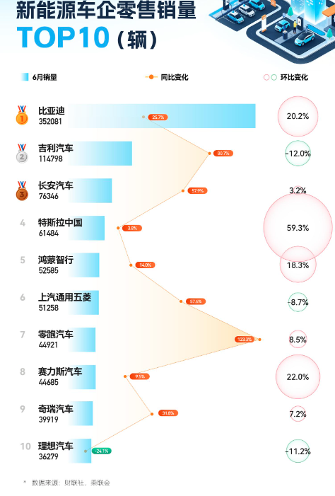 具体来看,6月新能源车企零售销量TOP10榜单名单与5月相比未发生变化,榜单中的部分车企名次出现了调整。