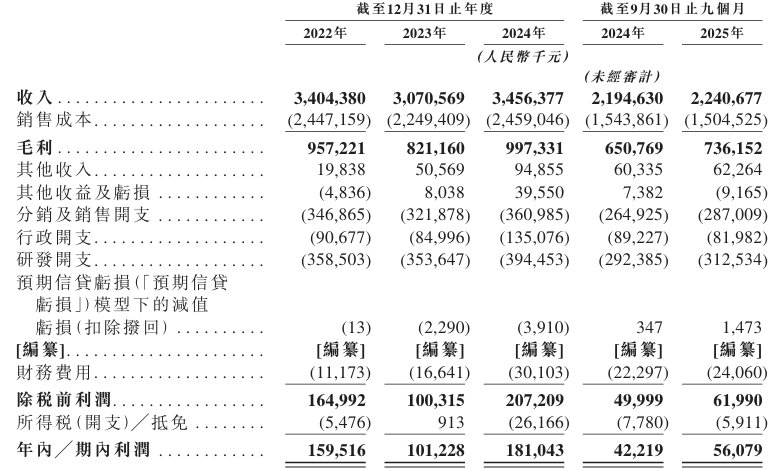 财务方面,于2022年度、2023年度、2024年度及2025年截至9月30日止九个月,该公司收入分别约为34.04亿元、30.71亿元、34.56亿元、22.41亿元人民币;同期,年/期内利润分别约为1.60亿元、1.01亿元、1.81亿元、5607.9万元人民币。