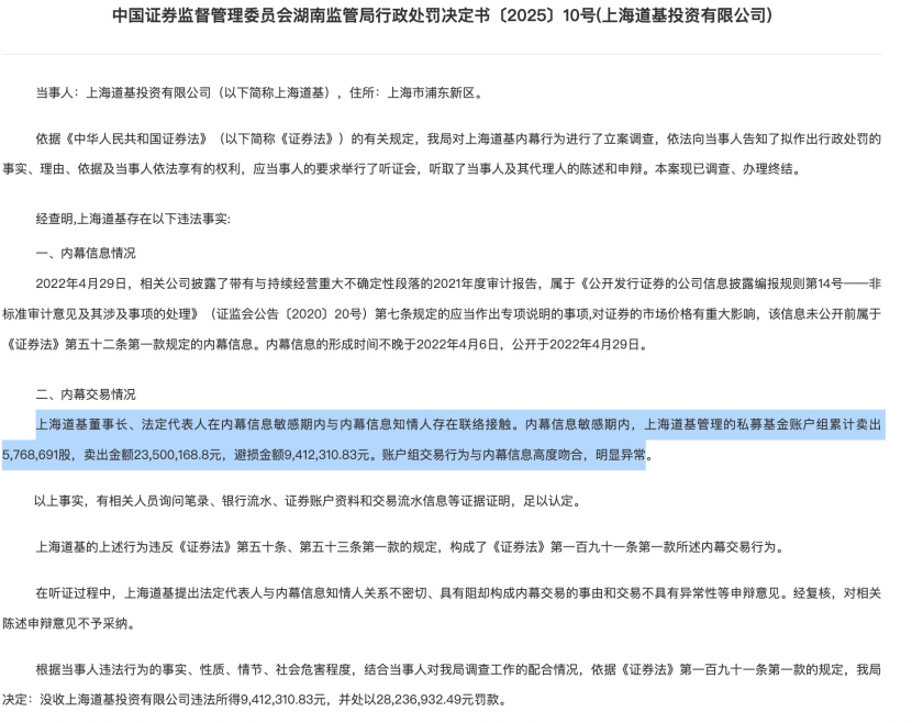湖南证监局7月4日披露,上海道基内幕行为一案现已调查、办理终结,该局决定没收该私募违法所得941.23万元,并处以2823.69万元罚款;作为此次内幕交易行为的直接负责的主管人员,上海道基董事长、法定代表人陈采芹,被给予警告,并处60万元罚款。综上,湖南证监局此次合计罚没3824.92万元。