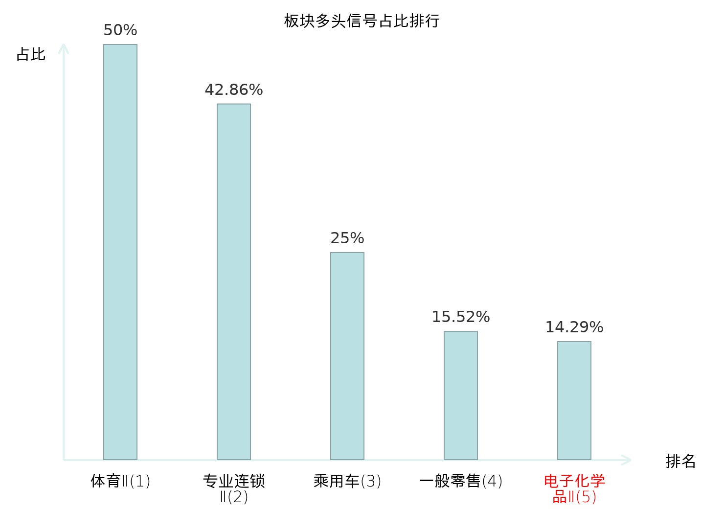全市场所有行业板块中主力多头信号占比排名中,体育Ⅱ板块位居第一。体育Ⅱ板块名次提升最快,较昨日上升129位。