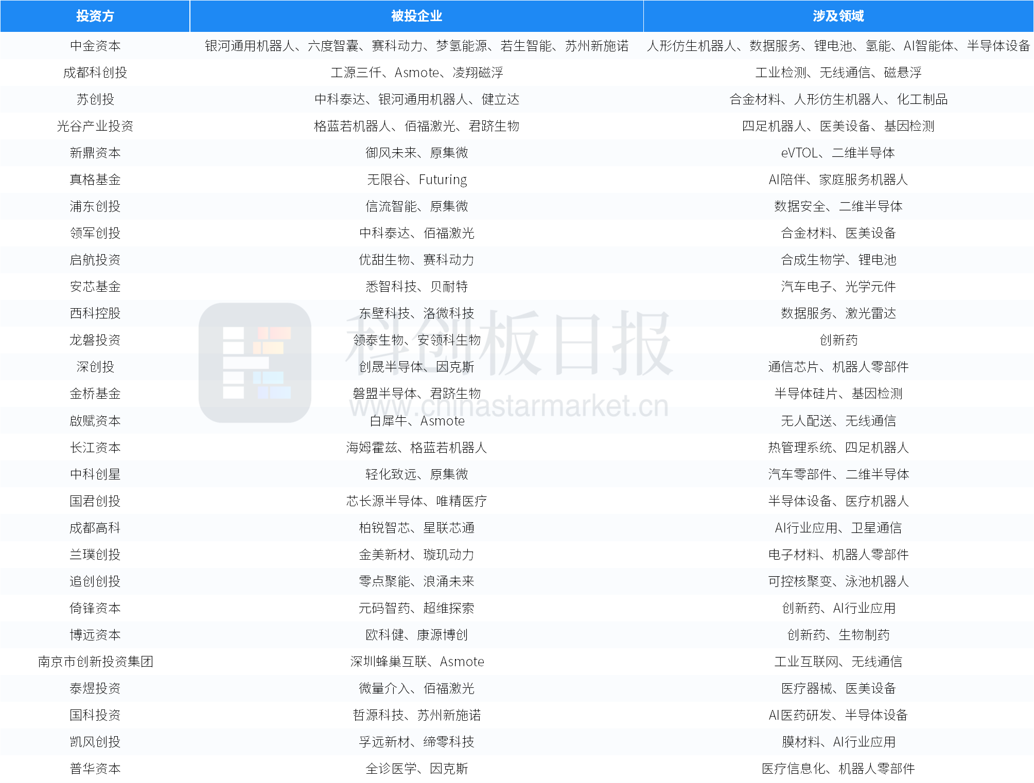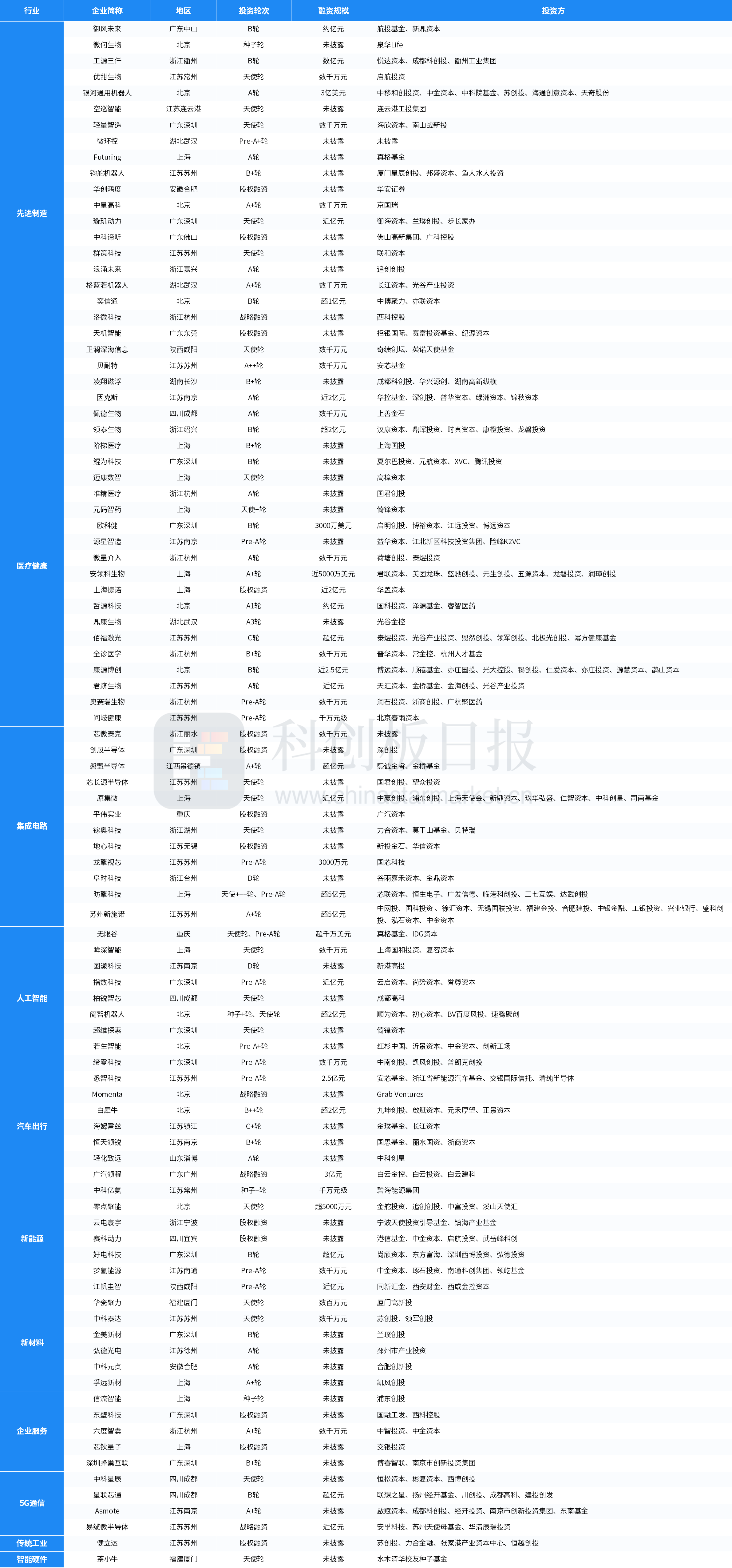从投资事件数量来看,本周先进制造、医疗健康、集成电路、人工智能、汽车出行、新能源等领域较活跃;从融资总额来看,先进制造披露的融资总额最多,约27.75亿元。银河通用机器人完成由中国移动链长基金领投,中金资本、中科院基金、苏创投、央视融媒体基金、天奇股份等联合参与的超3亿美元新一轮融资,为本周披露金额最高的投资事件。