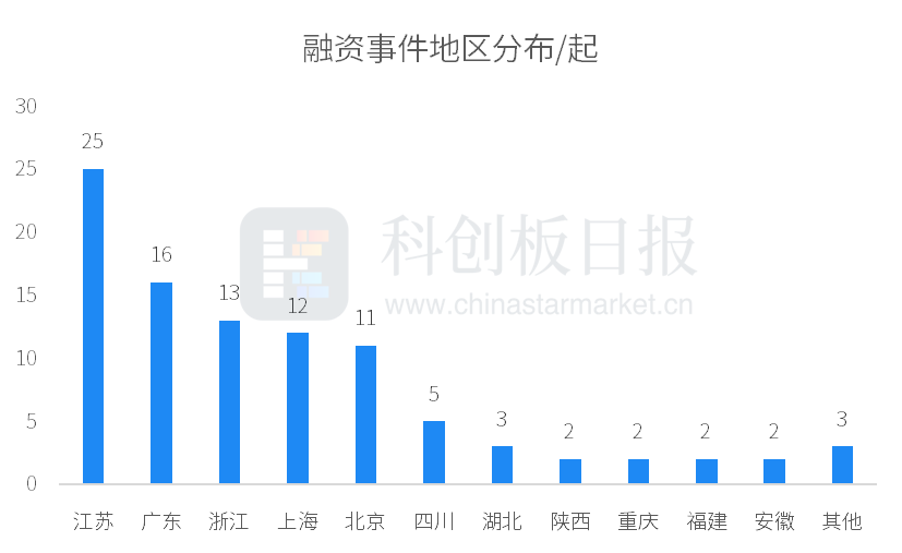 从地区来看,本周江苏、广东、浙江、上海、北京等地公司较受青睐,融资事件数均在10起以上;江苏以25起融资活跃度保持首位。从单个城市看,苏州有13家公司获投,位列第一;上海、深圳紧随其后,各有12家公司获投。