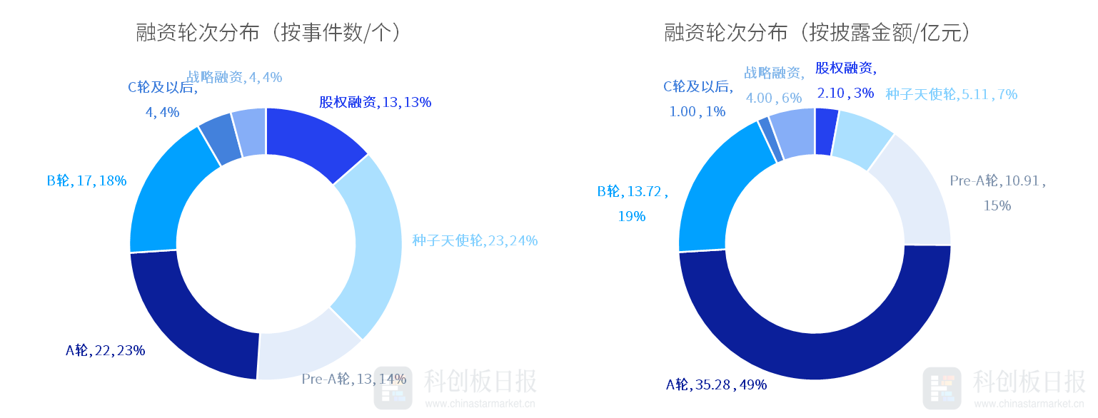 从投资轮次来看,除股权融资外,本周种子天使轮融资事件数最多,发生23起,占比约24%;其次是A轮,发生22起,占比约23%。从各轮次获投金额来看,A轮披露的融资总额最高,约35.28亿元;其次是B轮,约13.72亿元。