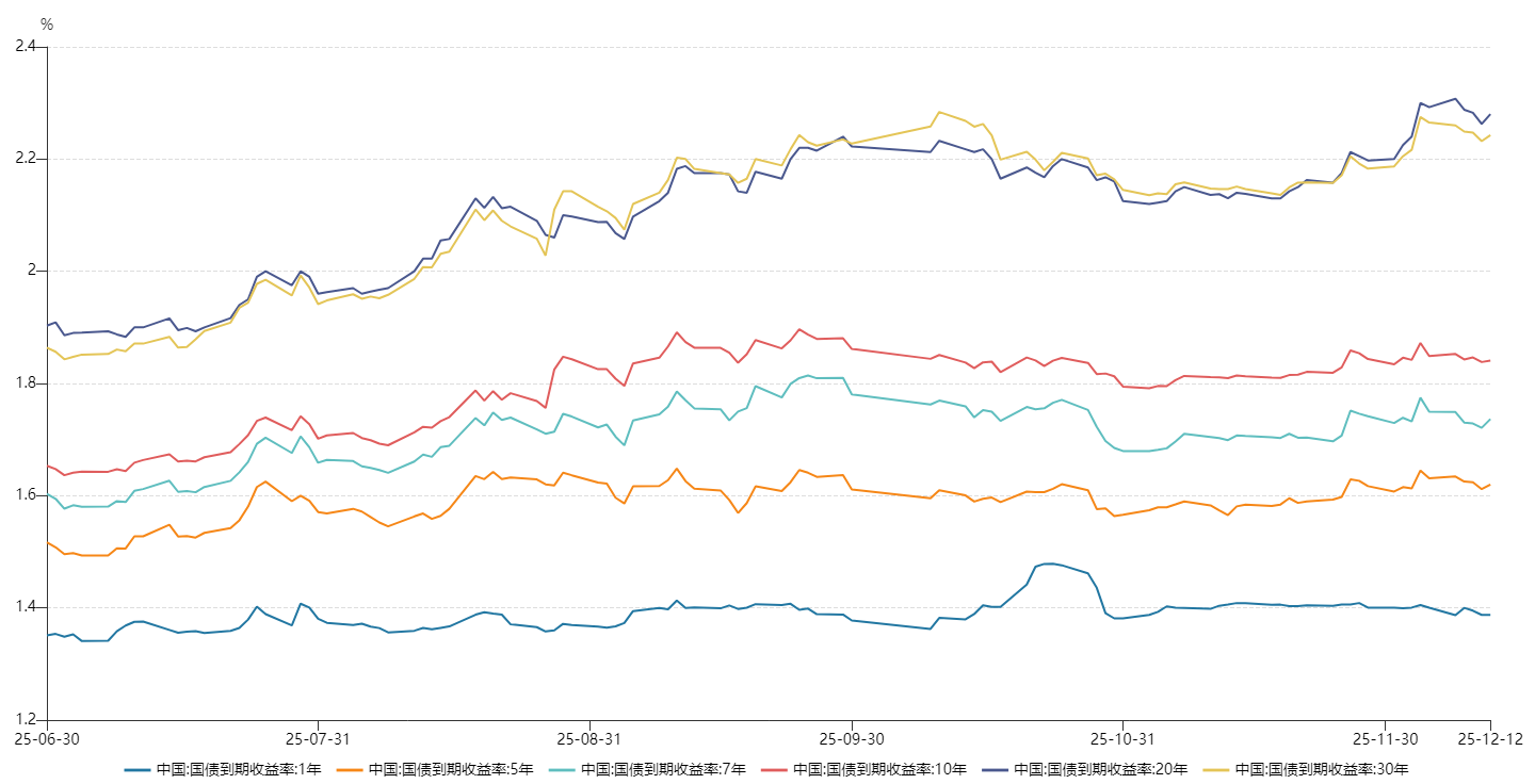 上周,主要利率债收益率震荡下行。截至12月12日收盘,1Y、5Y、7Y国债收益率分别报收1.39%、1.62%、1.74%,分别较前一周收盘变动-1BP、-1BP、-1BP;10Y、20Y、30Y国债收益率分别报收1.84%、2.28%、2.24%,分别均较前一周收盘变动-1BP、-1BP、-2BP。