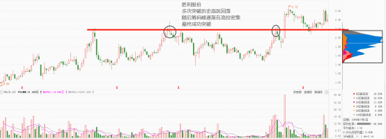 从图例2中很明显可以看到,胜利股份形成红线位置的阶段高区后出现了多次的试探拉升尝试突破,但受到前期的套牢盘压制出现反复回落,但最终随着筹码峰的逐渐上移以及集中,高位筹码逐渐被消化转移到下方,最终股价顺利突破。