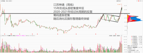 江苏神通在2015年在14-17元的高位区间形成历史头部密集套牢区,2020-2021年经过长周期的反复消化震荡处理之后,筹码峰逐渐在股价下方形成高位密集状态,这是符合我们前面的三个条件的完美案例,所以后市出现了一波突破拉升。