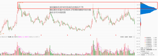 2016年银河磁体在一波拉升之后形成了历史高区27.79,随后股价在随后数次冲击到24-27的筹码重套牢区股价反复受到压制,出现多次回落走势。最终,历史高位成为筹码聚集突破压力较强的位置,是非常难以突破的压力区。