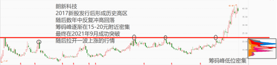 朗新科技新股上市后出现了一波快速的连板上涨,随后在22.4元形成历史最高点,随后多年在低位反复震荡消化,多次触碰历史高点后回落,筹码峰逐渐在15-20元附近密集,在2021年9月成功突破历史高点压制,随后开始了一波上涨行情。