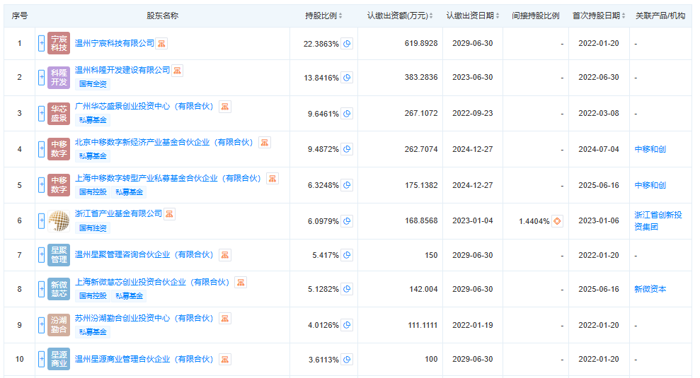 从股权结构方面来看,工商信息显示,星曜半导体前五大股东多为国有资本和产业私募基金,包括温州宁宸科技有限公司、温州科隆开发建设有限公司、广州华芯盛景创业投资中心(有限合伙)、北京中移数字新经济产业基金合伙企业(有限合伙)、上海中移数字转型产业私募基金合伙企业(有限合伙),持股比例分别为22.3863%、13.8416%、9.6461%、9.4872%、6.3248%。